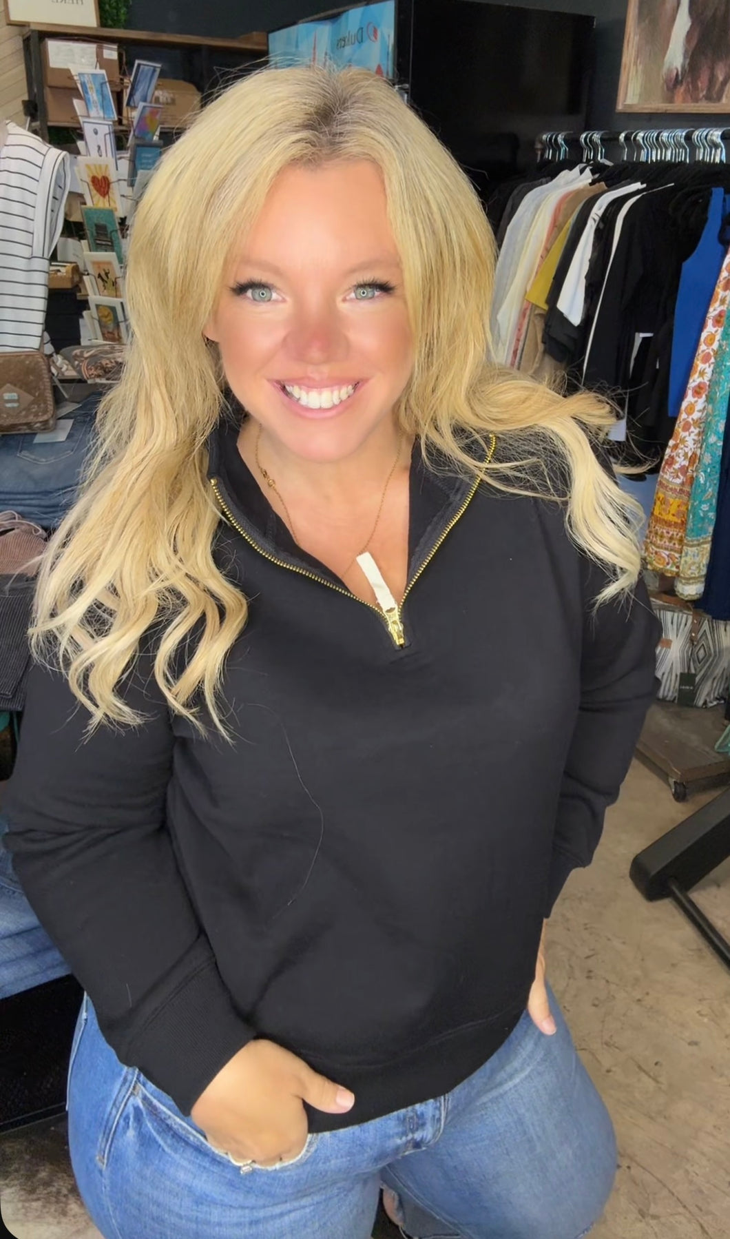 Cozy meets cool. This half-zip pullover is perfect for layering on chilly days or adding a sporty twist to your casual look. Easy to zip up or down, it keeps you comfy and stylish whether you're out for a stroll or lounging at home. Embrace effortless comfort with a playful edge!